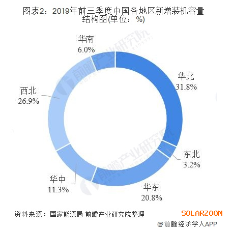 從新增裝機(jī)布局看,我國(guó)光伏發(fā)電由西向東的發(fā)展步伐穩(wěn)步推進(jìn),2019年前三季度,華北地區(qū)新增裝機(jī)508.6萬(wàn)千瓦,占全國(guó)的31.8%;東北地區(qū)新增裝機(jī)51.2萬(wàn)千瓦,占全國(guó)的3.2%;華東地區(qū)新增裝機(jī)332.2萬(wàn)千瓦,占全國(guó)的20.8%;華中地區(qū)新增裝機(jī)180.9萬(wàn)千瓦,占全國(guó)的11.3%;西北地區(qū)新增裝機(jī)430.8萬(wàn)千瓦,占全國(guó)的26.9%;華南地區(qū)新增裝機(jī)95.5萬(wàn)千瓦,占全國(guó)的6%。